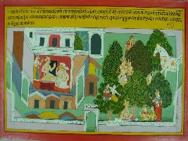 | Description / विवरण | Miniature painting based on Mahabharat - Ashwamegh parva depicting the city of Keshavdhi where the king doesn t have any work and the city is full of gold. In the garden of the same city king Neeldhwaja s son is love making with many females. At this time the horse of Arjun arrives. The beauty of horse is depicted that it is white with black eyes and has amazing neck. |
