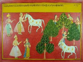 | Description / विवरण | Miniature painting based on Mahabharat - Ashwamegh parva depicting that the king Neeldhwaja s son finds a letter on the sacrificial horse and reads out the letter. |