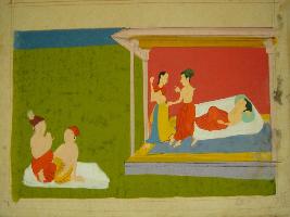 | Description / विवरण | An incomplete miniature painting of Nayaka depicting Nayaka in sleeping position while in the other side the Nayaka is again seen that talking with a man. Beside it the Nayaka is seen with Nayika. |