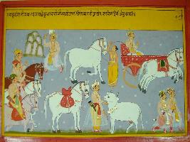 | Description / विवरण | Miniature painting based on Raghuvansha depicting Kumar coming with his army and meet Nandanidhenu on the way. Indra is also depicted in the painting. |