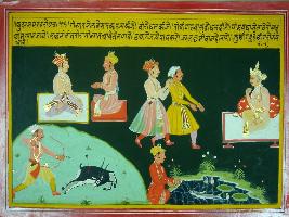 | Description / विवरण | Miniature painting based on Mahabharat - Udyam parva. A scene based on the speech of Vidur where Vidur tells about qualities of Pandavas as related to Dharma. On the painting one hunting scene and a fish catching scene also depicted to elaborate them. |