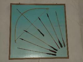 | Description / विवरण | This is a framed set of bow and arrows. Seven arrows are arranged in the display with the multicoloured feather ends |