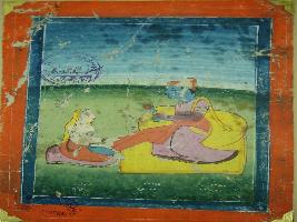 | Description / विवरण | Miniature painting depicting Nayak and Nayika, Nayika is pressing the feet of Nayak. |