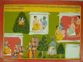 | Description / विवरण | Miniature painting based on Mahabharat - Vana parva depicting that after cursed by Urvasi Arjun is going to Chitrasen and then to Indra. Then Indra says that Arjun is lucky and the curse will help him. At the lower right Urvasi is seen with other apsaras. |