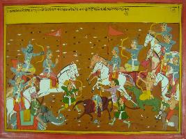 | Description / विवरण | Miniature painting based on Mahabharat - Ashwamegh parva depicting Arjun and Vibhishan fighting with each other. |