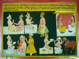| Description / विवरण | Miniature painting based on Mahabharat - Udyam parva. A clear picture of the thoughts of the human life and refer that the man who don t respect his master who don t serve the come animals who don t performs his dharma, like there man does not get the salvation in the end of his life. |