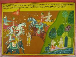 | Description / विवरण | Miniature painting based on Mahabharat - Ashwamegh parva depicting fight between Arjun and Vibhishan. Vibhishan is saying to Arjun that as he has conquered the world he has to fight with him. |