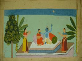 | Description / विवरण | Miniature painting depicting Krishna and Radha with two females attendant. It is an incomplete painting. |