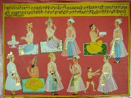 | Description / विवरण | Miniature painting based on Mahabharat - Udyam parva. It depicts that Krishna is having food at Vidor s place along with Brahmans. It was like as Indra having food at Dev s place. |