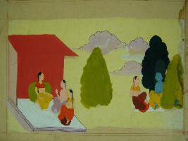 | Description / विवरण | Miniature painting depicting Krishna with Radha in left part while Radha with her friends in right part. It is an incomplete painting. |