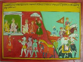 | Description / विवरण | Miniature painting based on Mahabharat - Ashwamegh parva depicting that after killing many demons and taking many wealth Arjun moves towards the kingdom of Babruvahana. |