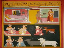 | Description / विवरण | Miniature painting based on Panchtantra depicting Chakradhar telling that the duty of a Brahman is teaching and begging. |