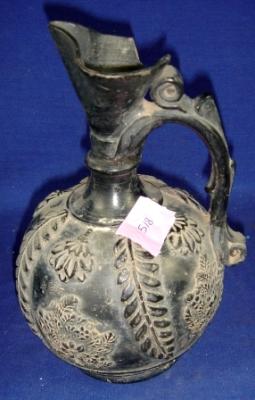 | Description / विवरण | Black goblet with flat circular base, bulbous body, long and thin neck and handle. The handle is having embossed floral designs. Mouth is partly broken. It was manufactured in Bengal. |