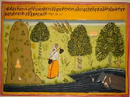| Description / विवरण | Miniature painting based on Kashi khand depicting Narad is going to Vindhyanchal through dense forest, elephants are bathing in the river. Vindhyanchal, a mountain where a forest is full of delicious fruits. |
