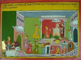 | Description / विवरण | Miniature painting based on Mahabharat - Ashwamegh parva depicting the kingdom of king Babruvahana which is full of gold and silver. It also depicts king Hansadhwaja offering one thousand gold to Babruvahana in respect. |