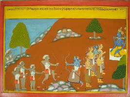 | Description / विवरण | Miniature painting based on Mahabharat - Vana parva.This painting depicted fighting scene between Mahadev in guise of Kirata and Arjun. At the left part of painting Pandavas is shown standing with folded hand in front of Vishnu. |