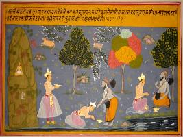 | Description / विवरण | Miniature painting based on Kashi khand depicting a scene of Vindhyanchal in which a king comes with a thali, bends down, Narad tells him to stand up, then both take their respective seats. |