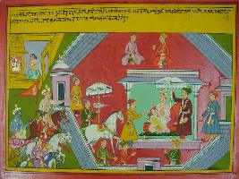| Description / विवरण | Miniature painting based on Mahabharat - Ashwamegh parva depicting when Arjun with king Hansadhwaja reach Baikunth he introduced himself and asked which city is this. Then the king replied that king Babruvahana is ruling this kingdom and it is he who is keeping your sacrificial horse. |