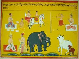 | Description / विवरण | Miniature painting based on Raghuvansha depicting the educational life of child Raghu. In the painting, Indra teaches Raghu about chariot riding, Shastragayana and literature education. At the lower part of the painting a pair of elephants and cows are seen. |