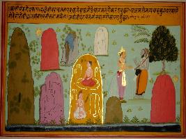 | Description / विवरण | Miniature painting based on Kashi khand depicting Narad meeting with Asthakul. It is the scene of Vindhyanchal, small peaks are shown. |