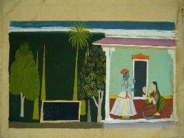 | Description / विवरण | Miniature painting depicting Krishna with Radha in palatial balcony. It is an incomplete painting. |