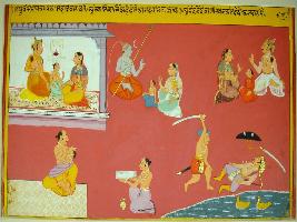 | Description / विवरण | Miniature painting based on Raghuvansha depicting affection and love for their child by the parents. In the upper part, Shiv is sitting with his son and wife, god Indra with his wife and son. Below it at the right lower corner, a Brahman seen with his child. |
