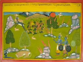 | Description / विवरण | Miniature painting based on Mahabharat - Vana parva depicting Dhritrashtara is telling Sanjay that when Krishna and Arjun burnt Knandava forest, Krishna foreseen death of Duryodhan. Khandava forest are shown burning with animal like stags, rabbit lion and birds running to safer place. Krishna is shown standing with Arjun in the forest at the lower left part. |