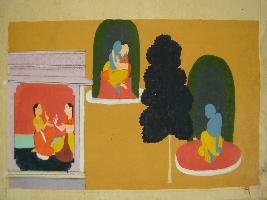 | Description / विवरण | Miniature painting depicting at the left side Krishna waiting for Radha in a bower. At the right side Radha talking to her friend and going to meet Krishna. At the centre loving union of Radha ad Krishna is depicted. It is an incomplete painting. |