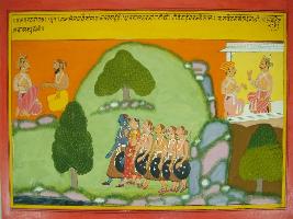 | Description / विवरण | Miniature painting based on Mahabharat - Vana parva. This painting depicts conversation between Vaispayan rishi and king Janmejaya at the upper right part. Sanjay is shown asking Dhritrashtra that why did he let Pandavas to go forest at the upper left of painting. |