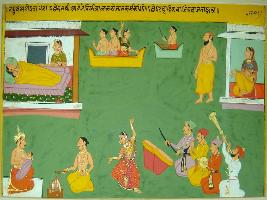 | Description / विवरण | Miniature painting based on Raghuvansha depicting the birth ceremony of child Raghu . People and gods are dancing and playing musical instruments. |
