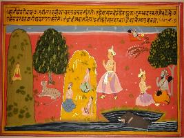 | Description / विवरण | Miniature painting based on Kashi khand depicting Meru mountain in the Vindhyanchal in which a tiger is seated, elephant is bathing in the river, Narad is seated with a king. |