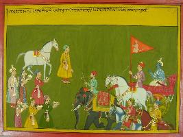 | Description / विवरण | Miniature painting based on Mahabharat - Ashwamegh parva depicting a man holding the rein of the sacrificial horse and many females are holding bowls full of jewels to greet and welcome Arjun who is coming towards them. |