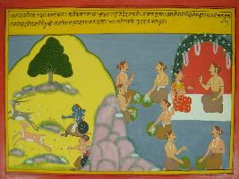 | Description / विवरण | Miniature painting based on Mahabharat - Vana parva depicting life of Pandavas in forest during exile. At the right part, theyare shown hunting deer and stage in forest. At the left part, they are shown eating food and Draupadi is sitting with one of Pandavas in a lower at upper part of painting. |