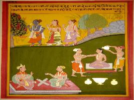 | Description / विवरण | Miniature painting based on Panchtantra depicting wife of Koli telling him that because of the kingdom Ram had to go to the forest. At the lower part coronation ceremony of a king is depicted. |