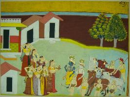 | Description / विवरण | Miniature painting based on Krishna avatar charit depicting Yashoda welcoming Krishna. Yashoda carrying plate with diya and is with some women, Krishna is standing with Balram, Gopas and cows. |