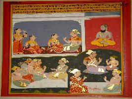 | Description / विवरण | Miniature painting based on Panchtantra depicting a Devta asking Koli to want something from him, then Koli s wife ask him to seek two heads and four hands from the Devta. |