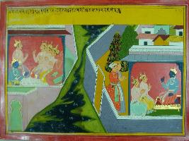 | Description / विवरण | Miniature painting based on Mahabharat - Sabha parva. It depictsYudhisthir is talking to Krishna about the construction of new palace. |