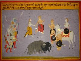 | Description / विवरण | Miniature painting based on Kashi khand depicting an army of demon on one side, Shiv, Brahma and Ganesh on the other side. Shukracharya is depicted talking to Shiv holding hand of a man. |