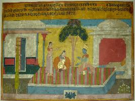 | Description / विवरण | Miniature painting based on Rasikpriya depicting Krishna and Radha in sitting position, under a tree, in front of a palace. The painting expresses the love of Radha to Krishna. |