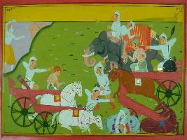 | Description / विवरण | Miniature painting based on Mahabharat - Ashwamegh parva depicting Abhimanyu fighting with Kaurava army in the way Shiv fight with demons. The story is narrated by Arjun to Babruvahana. |