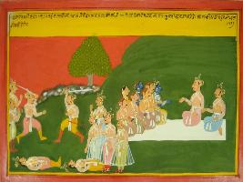 | Description / विवरण | Miniature painting based on Mahabharat - Vana parva depicting conservation between Pandavas, Draupadi and Krishna. They are shown sitting with Virat king and Dhristdhyun. |