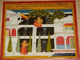 | Description / विवरण | Miniature painting based on Panchtantra depicting a view of palace along with fountains. A well dressed queen is seen in between the fountains. |