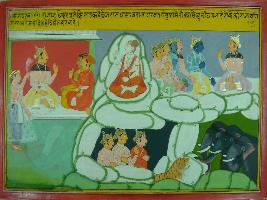 | Description / विवरण | Miniature painting based on Mahabharat - Sabha parva. The painting depicts Krishna is telling Yudhisthir that Jarasandha had kept many kings inside caves to get boon from Mahadev. |