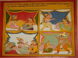 | Description / विवरण | Miniature painting based on Panchtantra depicting four scenes. On top right a noble male is talking to a female, left side top male is shown in angry mood and try to bit a woman. Below in right side, a male receiving drink from a female and left below a queen is going to be beaten. |