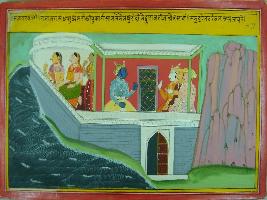 | Description / विवरण | Miniature painting based on Mahabharat - Sabha parva depicting wives of Kansa is asking Jarasandha for help. Krishna is depicted leaving Mathura and build another city at Dwarika. This city is build near sea and mountain. |