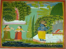 | Description / विवरण | Miniature painting based on Rasikpriya depicting Krishna waiting in the garden. In the right side of the painting Radha is seen, a gopi is delivering Krishna s message to her. |