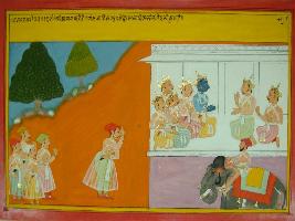| Description / विवरण | Miniature painting based on Mahabharat - Vana parva depicting Shri Krishn is sitting with Pandavas and other kings in the palace at the left part. One man is shown coming toward palace. |