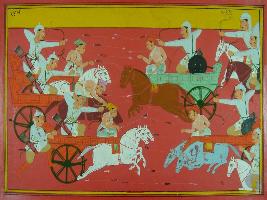 | Description / विवरण | Miniature painting based on Mahabharat - Ashwamegh parva depicting war scene between two armies. They are fighting with each other with bow and arrow. |