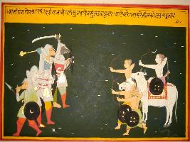 | Description / विवरण | Miniature painting based on Kashi khand depicting a scene of demon and god war. Shiv, Brahma and Ganesh depicted fighting with demons. |