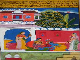 | Description / विवरण | Miniature painting based on Rasikpriya depicting Krishna touching the feet of Radha. Two female attendants are seen with them. At the background part of palace is seen. |